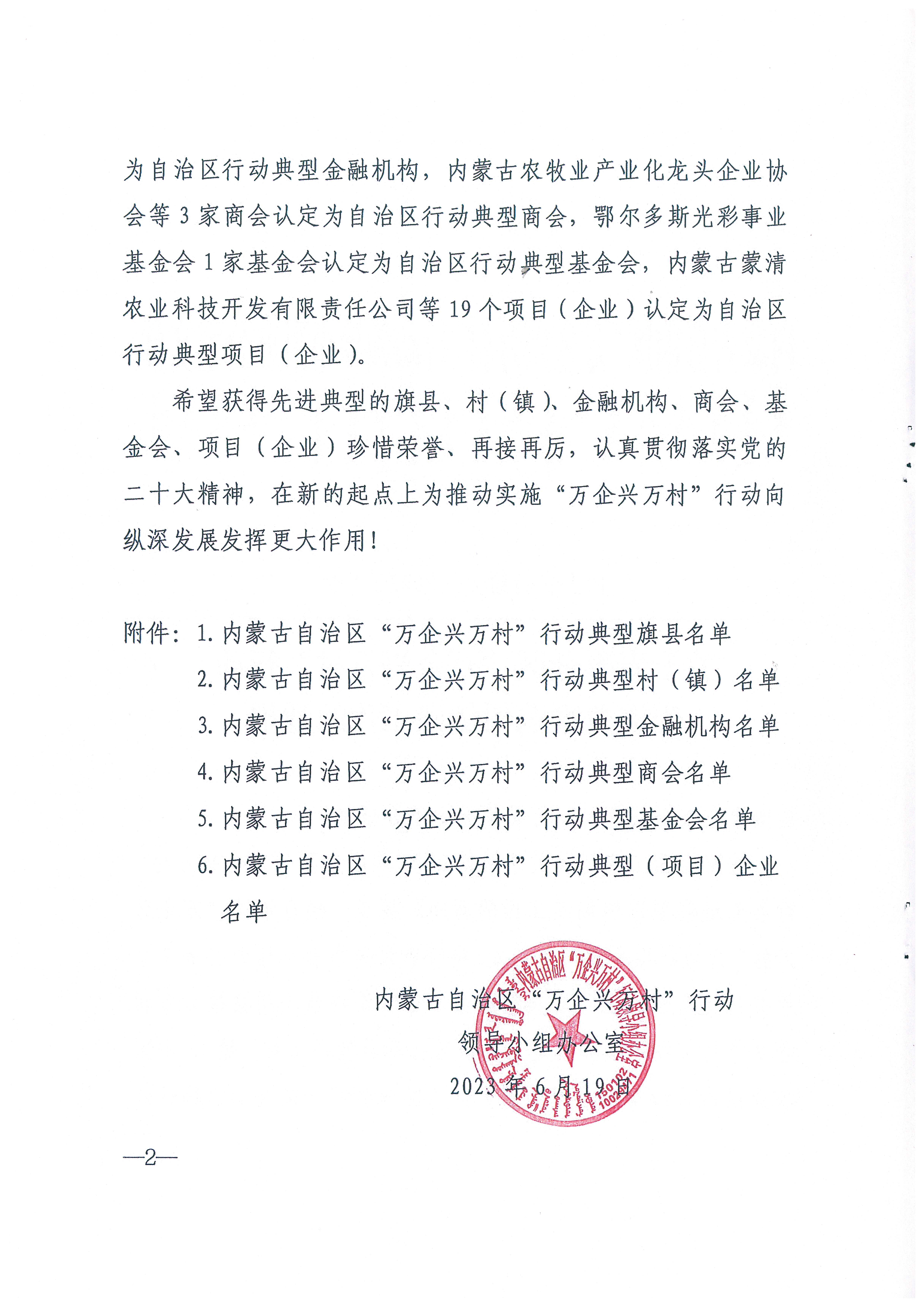 按照全國工商聯(lián)《關(guān)于做好 2023 年度全國“萬企興萬村行動先進典型選樹創(chuàng)建工作的通知》要求,經(jīng)自治區(qū)“萬企興萬村”行動領(lǐng)導(dǎo)小組研究決定,將呼和浩特市和林格爾縣等 7個旗縣認定為自治區(qū)行動典型旗縣,呼和浩特市武川縣福如東村等8個村(鄉(xiāng)、鎮(zhèn))認定為自治區(qū)行動典型村 (鄉(xiāng)、鎮(zhèn)),中國農(nóng)業(yè)銀行股份有限公司內(nèi)蒙古自治區(qū)分行等 3 家金融機構(gòu)認定為自治區(qū)行動典型金融機構(gòu),內(nèi)蒙古農(nóng)牧業(yè)產(chǎn)業(yè)化龍頭企業(yè)協(xié)會等 3 家商會認定為自治區(qū)行動典型商會,鄂爾多斯光彩事業(yè)基金會 1家基金會認定為自治區(qū)行動典型基金會,內(nèi)蒙古蒙清農(nóng)業(yè)科技開發(fā)有限責(zé)任公司等 19 個項目(企業(yè))認定為自治區(qū)行動典型項目(企業(yè))