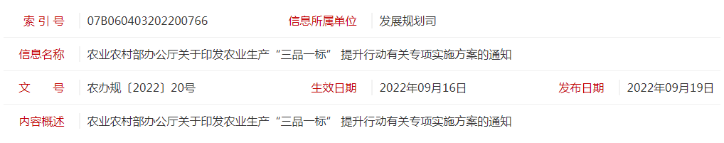 標題:農(nóng)業(yè)農(nóng)村部辦公廳關(guān)于印發(fā)農(nóng)業(yè)生產(chǎn)“三品一標” 提升行動有關(guān)專項實施方案的通知